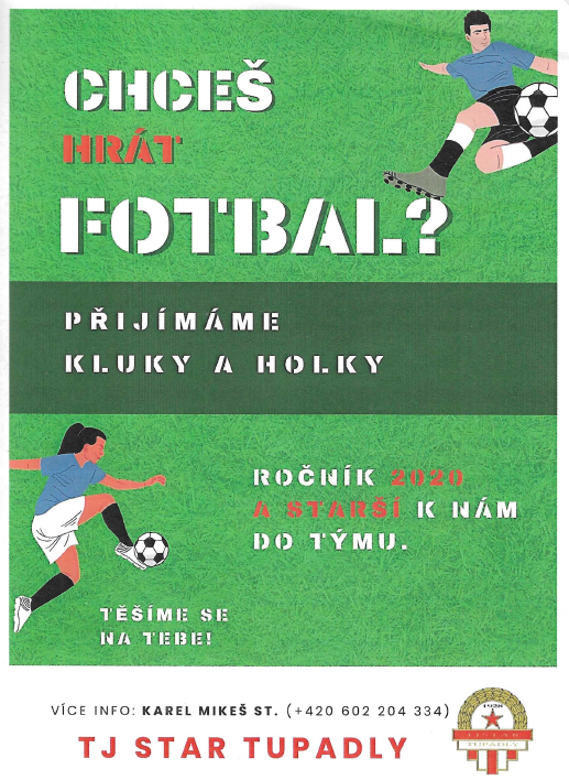 TJ Star Tupadly přijímá do týmu kluky a holky ročník 2020 a starší. Tak se staň fotbalovou hvězdou v hvězdném týmu! :-)