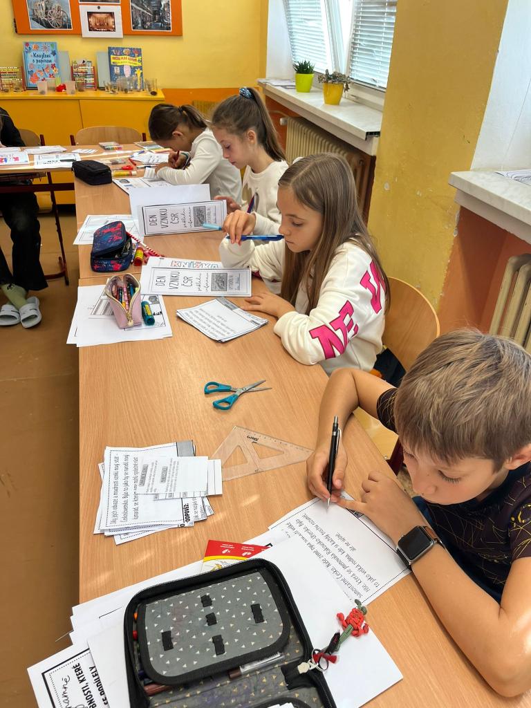 V pátek 24. 10. si naši žáci připomněli vznik Československé republiky. Obzvlášť se vydařila "živá trikolora" vytvořená žáky, kteří byli oblečeni v barvách naší vlajky.